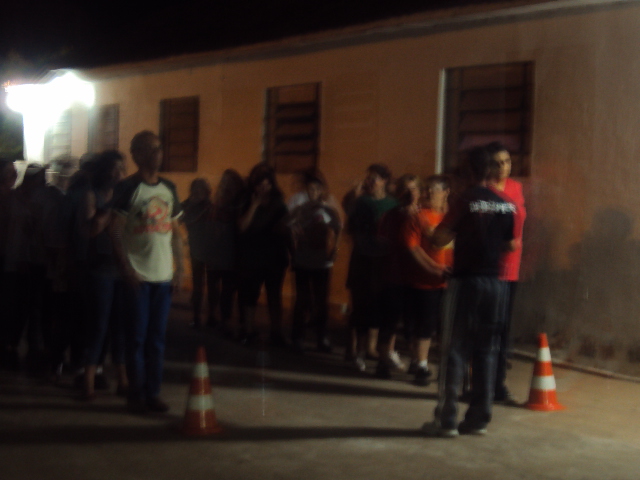 | Começamos com um pequeno circuito com bambolês e cones, onde em duas equipes cada participante deveria colocar o bambolê no outro cone... e o seguinte trazê-lo de volta.... |